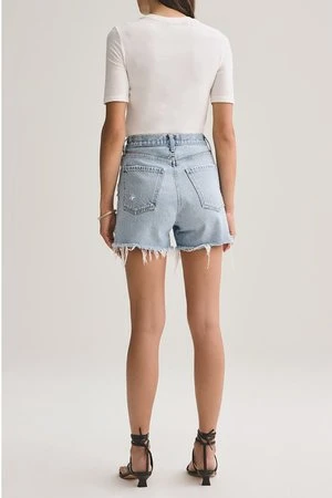 Agolde Dee super high rise short in chimes wash. Ultra high rise short with a closer fit around the thigh crafted from rigid pure cotton and side slits. Non-Stretch. Button fly closure.