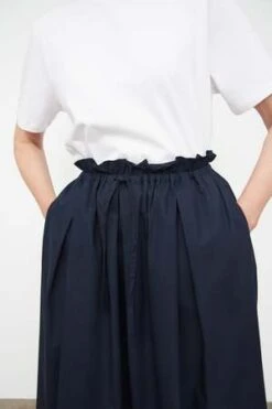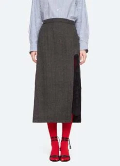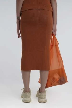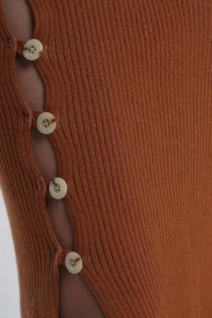 The Button-Up Kick Skirt is a rib knit midi skirt with button-down side split. Fit is stretchy and body-hugging, mid-rise elasticated waist. Buttons are acrylic, tortoise shell.
