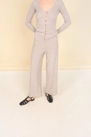 A pair of linen knit pants with an elastic waistband and raw cut hem