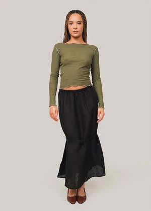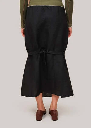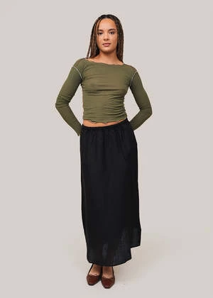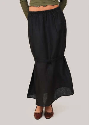 Black hemp skirt with belt loops below hip and elastic waistband. Comes with a hemp fabric belt for versatile styling.