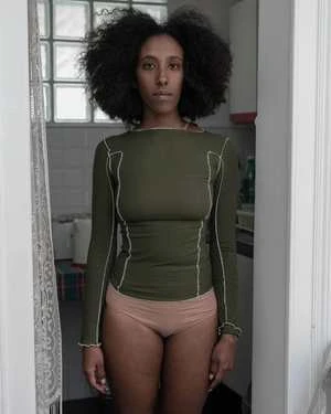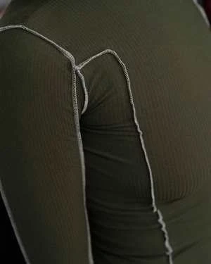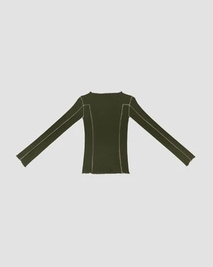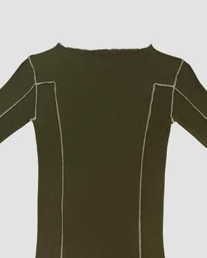Omato cotton top with princess line seaming detail. Slight boat neckline with ruffled edges. In color forest moss green, Conto. Exposed contrasting seams throughout. Made from ribbed organic cotton in Portugal. The philosophy behind Baserange is to create clean, easy and accessible garments that exist somewhere between modern culture and the natural world.