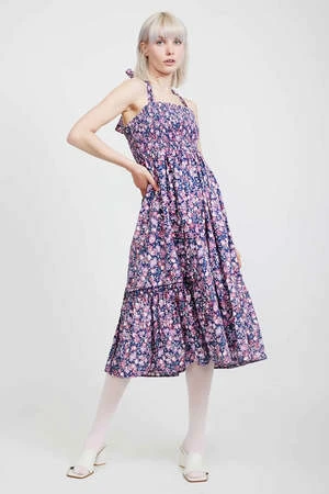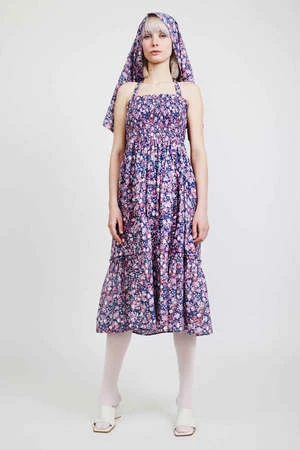 The Gwen Dress in Inglesham by Batsheva is a square neck, midi dress featuring halter strap ties and ruched bodice with a tiered skirt.