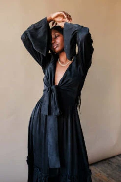 The Eugenie-Sue is a soft jersey dress featuring a round neckline, slim full length sleeve and a side split at the hem.