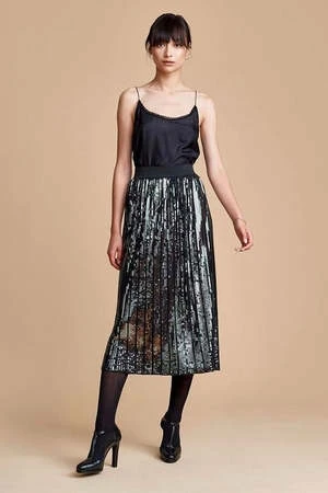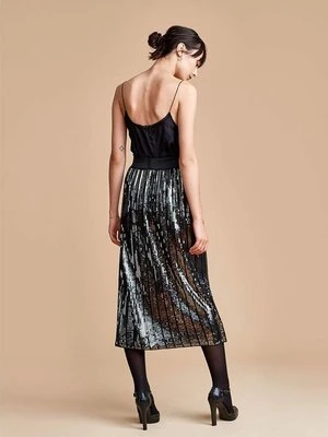 Coolest dinner party skirt with elasticated wait. Dark green and grey sequins on a black base.