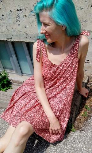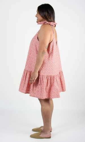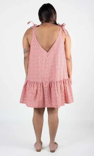Eleanor is a relaxed fit dress with a wide bottom ruffle and tie straps. It is fully lined and slips over the head or up over the hips.