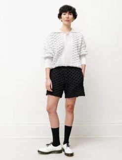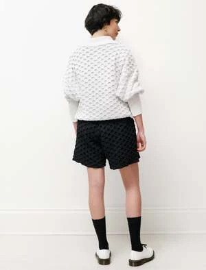 Unique knit shorts made from a lightweight, dry-feel polyester paper fabric. The Oriel shorts are aptly named after the small window-like structures throughout the garment, offering a one of a kind look and feel. Featuring two side seam pockets and a drawstring waistband, these shorts offer comfort without compromising an elevated style.