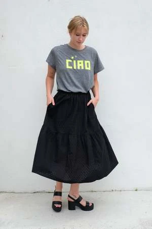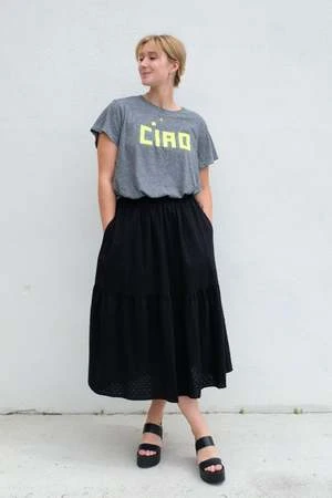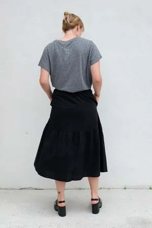 The Clare V. Manon Skirt Rattan Eyelet is the perfect easy-wear piece for any season. Made with an elastic waist and side pockets, it has the perfect fullness to flatter the figure. Wear it with sandals and a tee in the summer, or boots and a chunky sweater in the winter.
