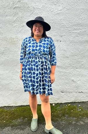 Indigo Cotton Dresses Handblock Dresses. This dress may look like a simple one but it fits and falls like a dream. Flattering to all body types, it has a shirt collar and box pleats in the skirt area. It has a big flare and the excess frill at the lower part makes it fall so well. Bonus- It comes with two pockets !!