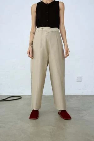 Relaxed and comfortable, these tapered pants feature a unique pattern with a draped effect at the front. Side pockets and offset zipper with button closure.