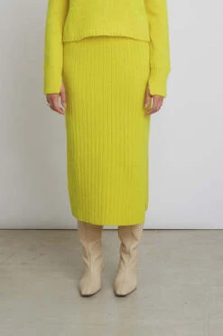 Zoe is our versatile, flat-rib sweater tube-skirt, to pull-on-and-go as an easy wardrobe stable for a head-to-toe sweater-dressing look. The skirt has a flattering high-waist proportion with an elasticated, waistband trim to position where suits and a dressy kick-split on the wearers left-side.