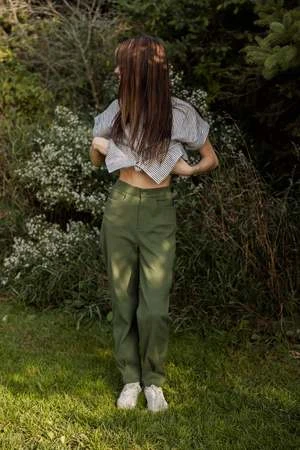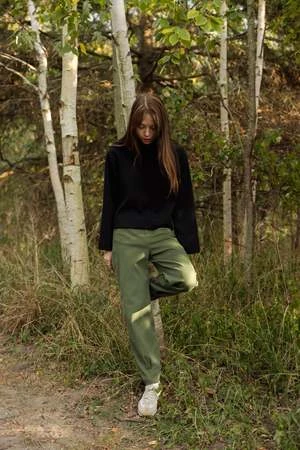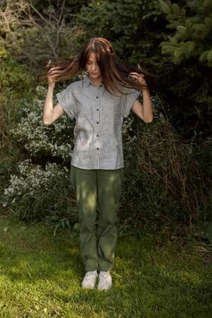 Eve Gravel’s Cambridge Pants will take you back to school! These comfortable trousers are made out of stretchy textured cotton. They have a high waist, front zipper and classic 4-pocket design. They have a slouchy shape in the leg, while the pleats at the hem make them more fitted in the ankle. Pair them with the matching Brighton Blazer Jacket or Vienna Top for a full set.