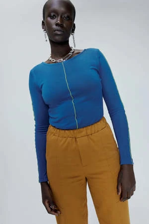 High-waisted pants made from a 74% cotton and 25% linen OEKO TEX blend. It has side pockets and a back patch pocket. Topstitched cuts reinforce this attention to detail. Elastic waist for maximum comfort.