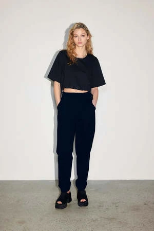High-waisted pants made from a 74% cotton and 25% linen OEKO TEX blend. It has side pockets and a back patch pocket. Topstitched cuts reinforce this attention to detail. Elastic waist for maximum comfort.