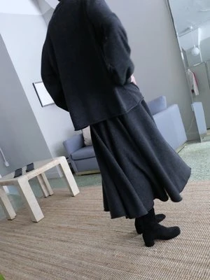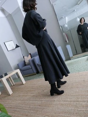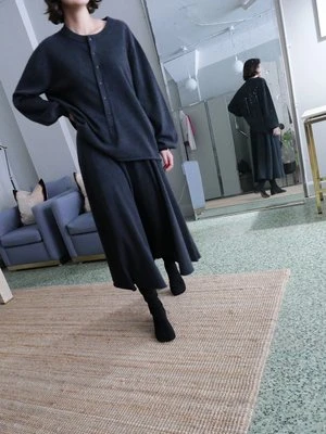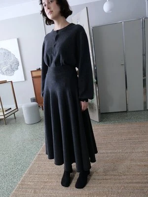 EXTREME CASHMERE N313 TWIRL SKIRT IN SHADOW. A MIDI CIRCLE SKIRT THAT FOLLOWS YOUR MOVEMENTS EVERYWHERE YOU GO. THE RIB-KNITTED WAISTBAND CONTAINS A CORD ON THE INSIDE THAT ALLOWS YOU TO ADJUST THE FIT. MACHINE WASHABLE. ONE SIZE. SUITABLE FOR SMALL TO MEDIUM BODIES. WAIST WIDTH MEASURES 11 1 / 2 INCHES AT REST, TOTAL LENGTH IS 31 INCHES.
