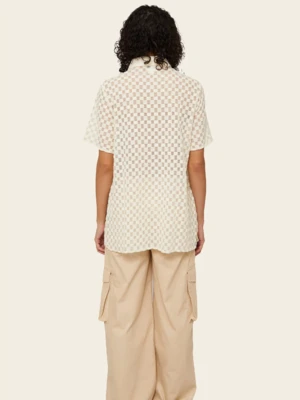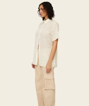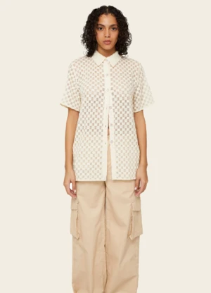 The Harmony Checkered Mesh Button Down features a boxy, masculine fit with a feminine checkerboard mesh fabric. This versatile oversized button-down can be worn with any outfit, any season.