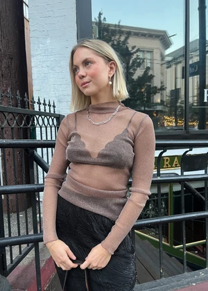 This mockneck top is a single layered full length long sleeve with lettuce trim detailing. Featuring a slightly shimmer mesh fabric that is ultra soft, comfortable, and weightless.