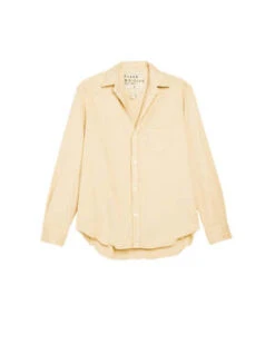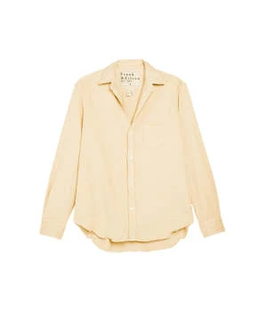 The Eileen Relaxed Button-Up Shirt in Daisy by Frank and Eileen is their signature button front top featuring a relaxed, loose fit, and distressed detailing crafted in a famous denim fabrication.