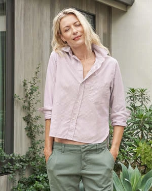 The Silvio Button Up in Wine Stripe by Frank and Eileen a laid back take on modern Italian tailoring featuring a petite square fit and exaggerated back pleat crafted in an heavyweight, cotton, Italian Oxford fabric.
