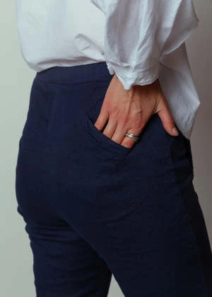 Hannoh Wessel’s Paoletta Pant features a button fly, elasticized back, slash hip pockets and a straight leg.