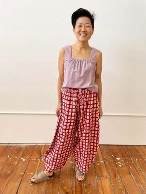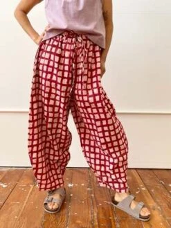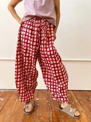 These pants have been dyed with natural dyes and hand block printed to obtain this particular pattern.