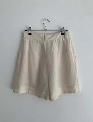 Loosely tailored pleated short constructed from a Japanese linen with a soft hand and drape. Fitted waistband hits at the waist, two pleat front and side slant pockets. Unlined.