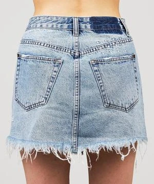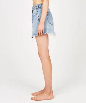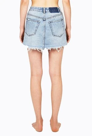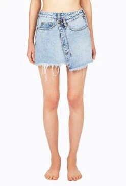The Rap Skirt is a classic mini skirt in a rigid denim construction. This style features an asymmetric front with wrap detail, five pockets, and distressing throughout.