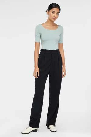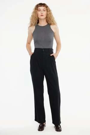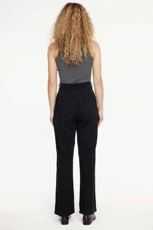 Classic everyday slacks with a wide waistband, full length, straight leg, button fly and subtle pleats. Made in a lightweight, textured cotton/tencel blend canvas.