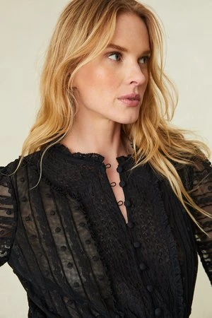 – Sheer long blouson sleeves with elasticated ruffle openings.