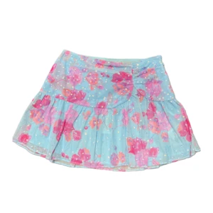 Loveshackfancy Blue Mini Skirt with Pink Floral Detail.