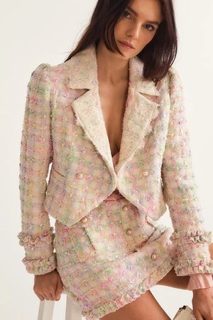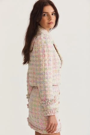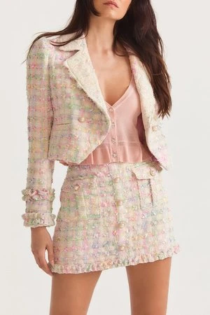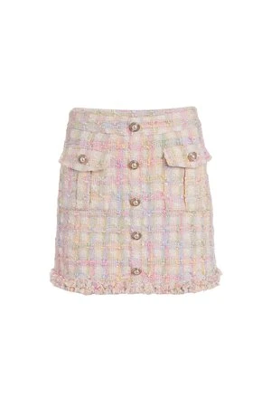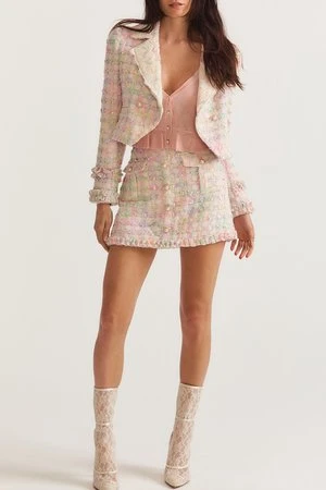 The new Nate Skirt is elegance reimagined. In a pastel-hued tweed, this mini features a faux placket skirt with pleated patched pockets and a playful fringed hem. With a full interior lining and a side seam zipper for closure on the wearer’s left, this skirt is as functional as it is flirty. Also available in color Black neutral.