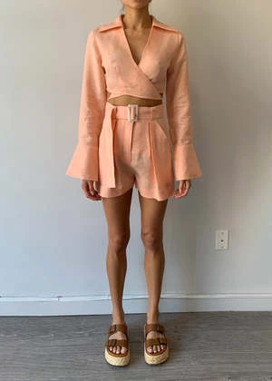 The Pleated Short in Linen by Matthew Bruch is a high waisted, belted short crafted in a rich linen. Featuring side slant pickets and a zip fly, these shorts are a versatile closet staple. Pair with a cropped top for a complete look.