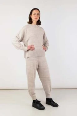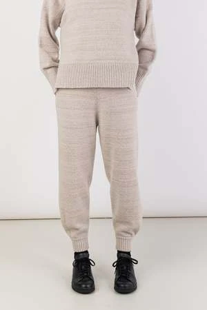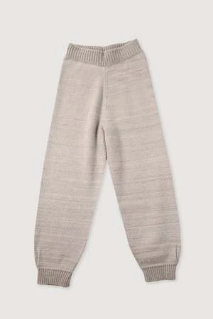 Mid-weight knit pant made from soft boucle yarn. The pant features a wide rib waistband and tuck detail at bottom of the leg.
