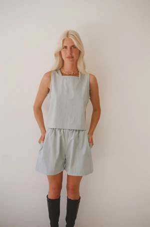 Relaxed fit, elastic waist Shorts are ‘Jamaica’ style and sit mid thigh. They have side seam pockets and two patch pockets on the backside.