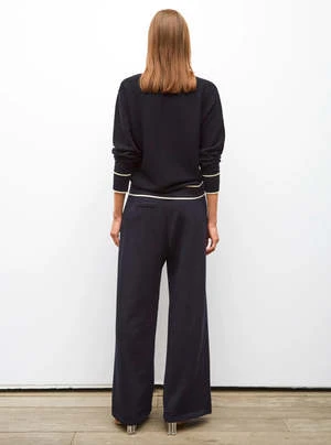 Generous, straight leg knitted pant. No side seams. Double pleats at front. Slash pockets at front.