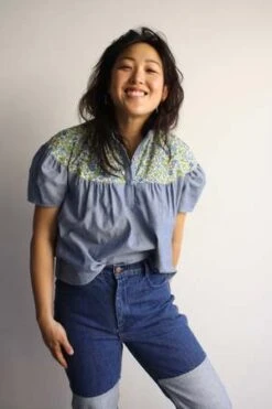 Sweet and easy one size blouse with a half moon yoke and floral buttons. We designed this top with vintage textiles in mind and many colors are limited editions to make use of special small pieces.