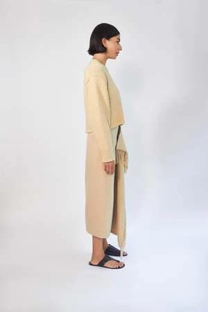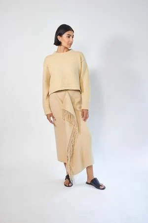 Luxurious creme light double wool and tactile blanket fringing make the ‘Liza’ skirt from Nanushka a comfortable, confident proposition. The timeless pencil skirt silhouette is elevated with an integrated draped wrap front that adds structure and movement. Play with textures by teaming it with a rigid leather jacket.