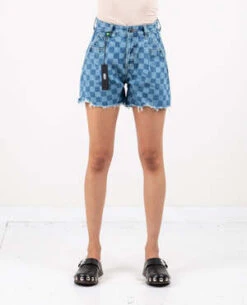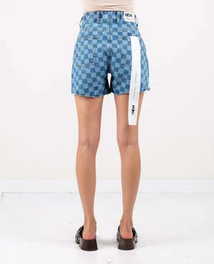 Betty shorts in indigo checker by Neon Denim Brand. The perfect cut-off shorts for a day spent lounging in the sun. Made from 100% cotton, these shorts are comfortable and breathable, with a high rise waist and slash pockets with a pleat. The frayed hem gives them a relaxed look.