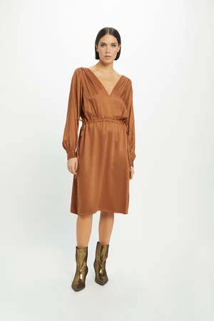 A beautiful, versatile dress for every season, Gina is understated glamor. Long sleeves give an elegant cover-up, and a delicate, hand-tied drawstring on the waist allows for casual styling. In a sophisticated below-the-knee length, the Gina dress is great with boots for every day, or heels for a night-time look. A feminine wrap neckline teamed with ruched shoulders completes the silhouette.