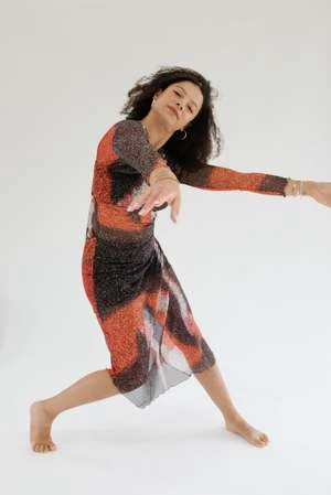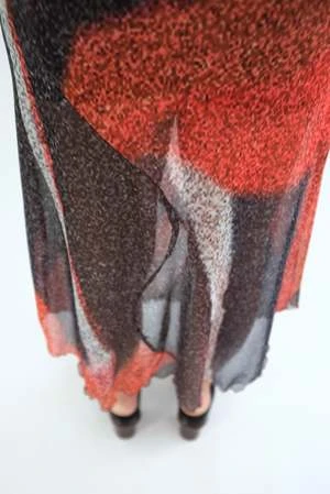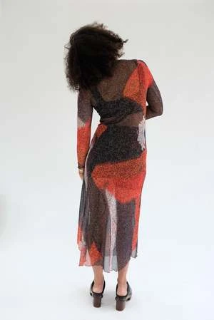 Handmade mesh maxi dress, long sleeve, lettuce hem finish. Finishes above the ankle and features a small side slit to enable movement. 93% mesh, 7% spandex made in Mexico. Worn with Beklina Gogo Bikini.