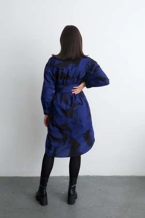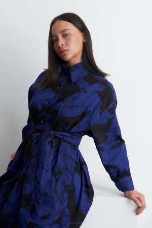 100% cotton unisex shirt dress. Easy oversized fit with a breast pocket and tie belt. White shell buttons.