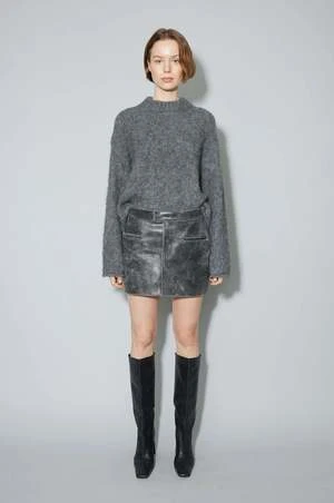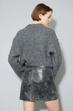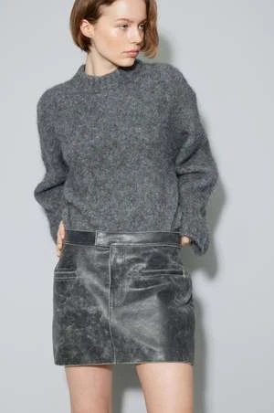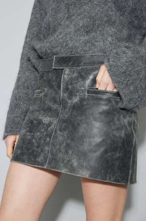 Vintage-look leather mini skirt. Made in heavy weight distressed leather with worn, vintage look. Featuring concealed zip and hook closure. Two welt pockets at the front. Fitted seams at the back. Fully lined. Short and fitted.