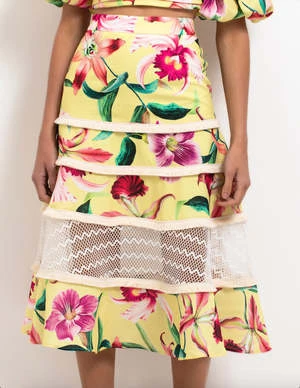 The Laelia Fringe Trim Midi Skirt in Canary by Pat Bo is a high waisted, tiered skirt featuring a fringe trim and knitted sheer panel crafted in a bold floral fabrication.