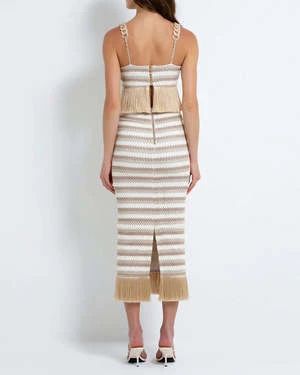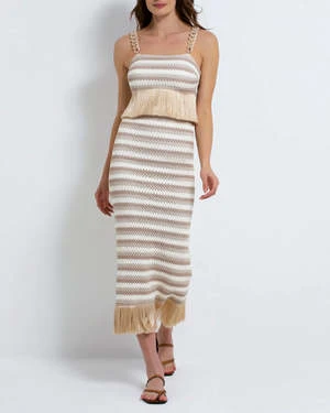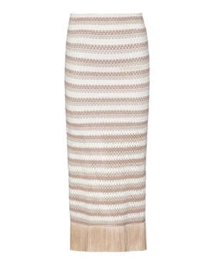The Striped Crochet Fringe Trim Maxi by PatBo is a high waisted, crocheted skirt featuring a fringe trim detail. Pair back to the matching Striped Crochet Fringe Trim Top by PatBo.