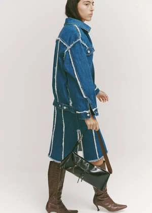 Knee length skirt with side splits and button-fly closure, featuring external seam detail and contrast topstitching throughout.