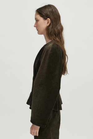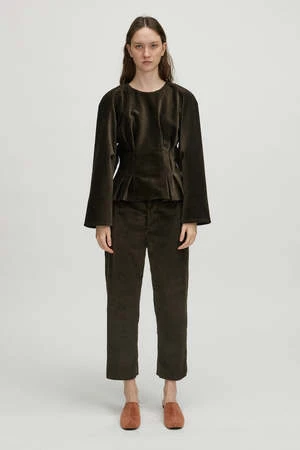 The Basco Top by Rachel Comey is a crew neck, bias-cut top with release pleats at front and back, in plush Wide Wale Corduroy. This style has a fit-and-flare silhouette with a cocoon raglan sleeve and a keyhole with button closure at back of neck.