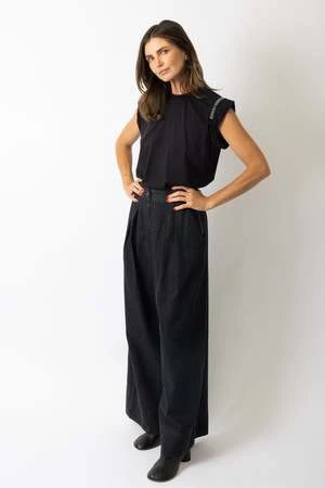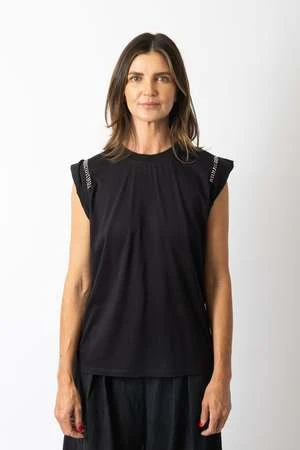 Soft sleeveless black tee with a permanently rolled-up sleeve and white crochet stitch detail.