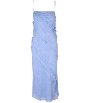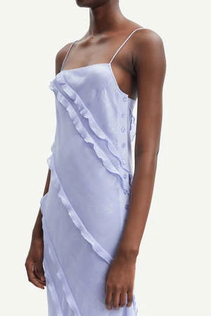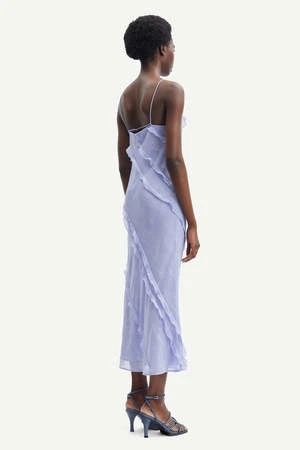 The Mannah Dress in Easter Egg by Samsoe Samsoe is a midi length, slim fit dress featuring diagonal ruffle details, side seam button details, and hem slit.