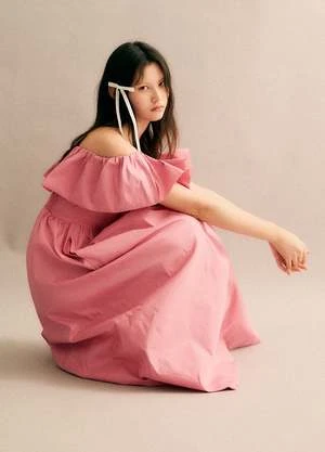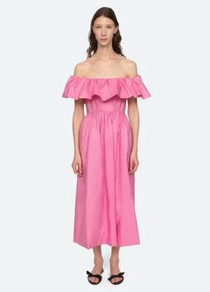The Diana taffeta off the shoulder dress features an oversized off the shoulder ruffle and full skirt.