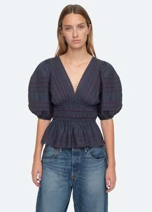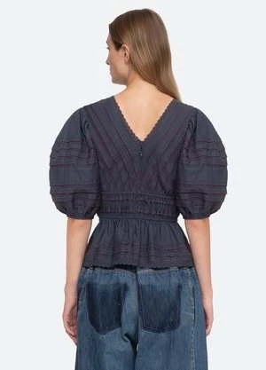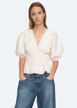 The Mable top features puff sleeves, v-neckline, pleated detailing and lace trim.