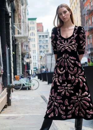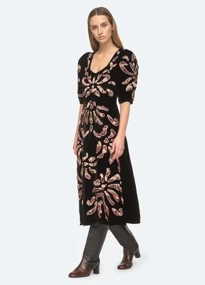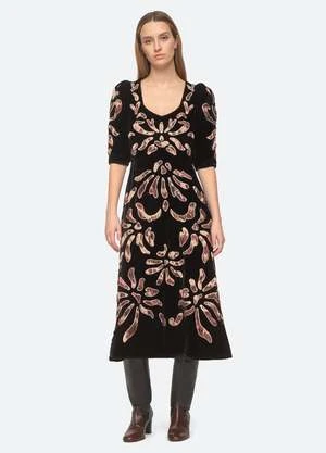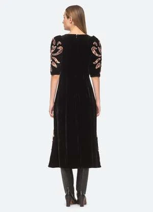The Veda velvet applique dress features puff sleeves and tie-dye appliques throughout.